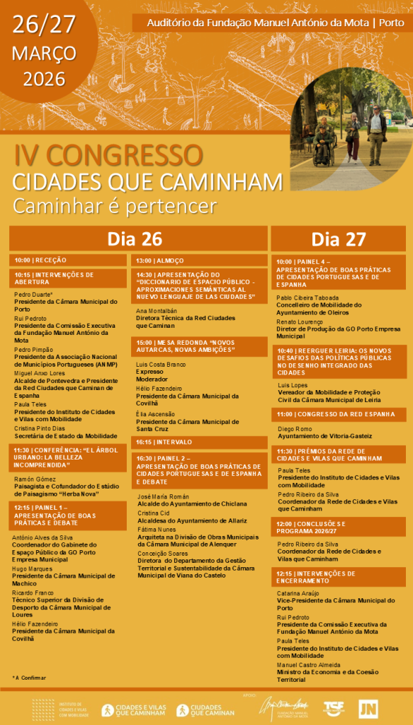 Sob o tema “Caminhar é Pertencer”, o Congresso terá lugar nos dias 26 e 27 de março de 2026, no Auditório da Fundação Manuel António da Mota, na cidade do Porto, reunindo membros do Governo, autarcas, técnicos municipais, especialistas nacionais e internacionais e representantes de municípios portugueses e espanhóis.